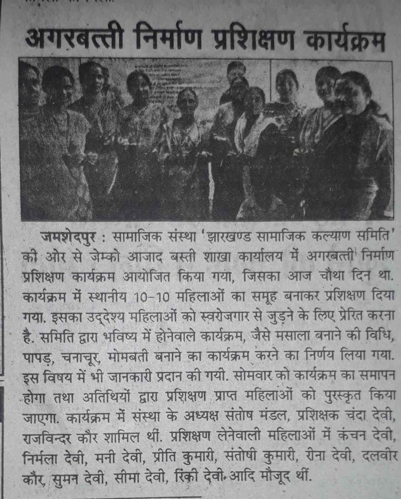 झारखंड सामाजिक कल्याण समिति की ओर से जेएमको आजाद बस्ती शाखा कार्यालय में अगरबत्ती निर्माण प्रशिक्षण कार्यक्रम आयोजित किया गया। शुक्रवार को चौथा दिन था। 10-10 का समूह बनाकर महिलाओं को अगरबत्ती बनाने का प्रशिक्षण दिया गया। इस कार्यक्रम में महिलाओं को स्वरोजगार से जुड़ने के लिए प्रेरित किया गया।